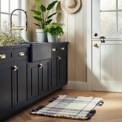 Add textural flair to your indoor space with this Laurelhurst Plaid Rug from Threshold™ designed with Studio McGee. Featuring a woven black and white plaid pattern with fringe edges, this handmade indoor rug creates an inviting appeal for your home. Complete with a flat pile height for easy cleaning, this indoor rectangle rug provides soft comfort underfoot whether you display it in your entryway, kitchen or living room.